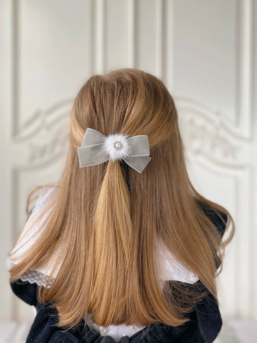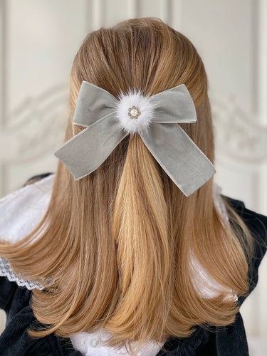 Baby Velvet Embellished Pom Pigtail Bow Set - Grey